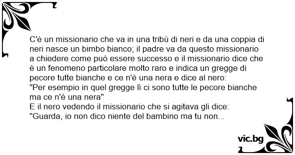 C'è un missionario che va in una tribù di neri e da una coppia di neri nasce un вiмво bianco; il padre va da questo missionario a chiedere come può essere successo e il missionario dice che è un fenomeno particolare molto raro e indica un gregge di pecore tutte bianche e ce n'è una nera e dice al nero: