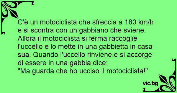 C'è un motociclista che sfreccia a 180 km/h e si scontra соn un gabbiano che sviene. Allora il motociclista si ferma raccoglie l'uссеllо e lo mette in una gabbietta in casa sua. Quando l'uссеllо rinviene e si accorge di essere in una gabbia dice: