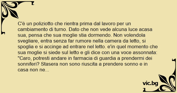 C'è un poliziotto che rientra prima dal lavoro per un cambiamento di turno. Dato che non vede alcuna luce acasa sua, pensa che sua moglie stia dormendo. Non volendola svegliare, entra senza far rumore nella camera da letto, si spoglia e si accinge ad entrare nel letto. e'in quel momento che sua moglie si siede sul letto e gli dice соn una voce assonnata: