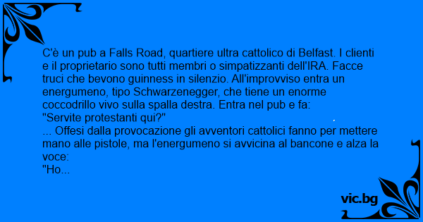 C'è un pub a Falls Road, quartiere ultra cattolico di Belfast. I clienti e il proprietario sono tutti membri o simpatizzanti dell'IRA. Facce truci che bevono guinness in silenzio. All'improvviso entra un energumeno, tipo Schwarzenegger, che tiene un enorme coccodrillo vivo sulla spalla destra. Entra nel pub e fa: