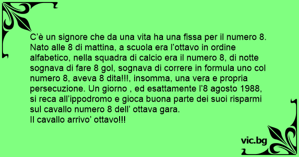 C’è un signore che da una vita ha una fissa per il numero 8. Nato alle 8 di mattina, a scuola era l’ottavo in ordine alfabetico, nella squadra di calcio era il numero 8, di notte sognava di fare 8 gol, sognava di correre in formula uno col numero 8, aveva 8 dita!!!, insomma, una vera e propria persecuzione. Un giorno , ed esattamente l’8 agosto 1988, si reca all’ippodromo e gioca buona parte dei suoi risparmi sul cavallo numero 8 dell’ ottava gara.