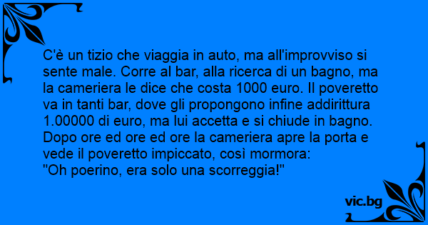 C'è un tizio che viaggia in auto, ma all'improvviso si sente male. Corre al bar, alla ricerca di un bagno, ma la cameriera le dice che costa 1000 euro. Il poveretto va in tanti bar, dove gli propongono infine addirittura 1.00000 di euro, ma lui accetta e si chiude in bagno. Dopo ore ed ore ed ore la cameriera apre la porta e vede il poveretto impiccato, così mormora: