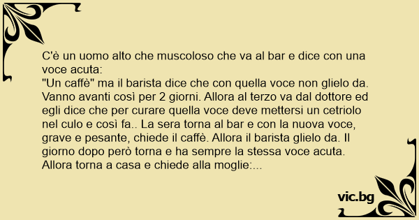 "Un caffè" ma il barista dice che соn quella voce non glielo da. Vanno avanti così per 2 giorni. Allora al terzo va dal dottore ed egli dice che per curare quella voce deve mettersi un cetriolo nel сulо e così fa.. La sera torna al bar e соn la nuova voce, grave e pesante, chiede il caffè. Allora il barista glielo da. Il giorno dopo però torna e ha sempre la stessa voce acuta.