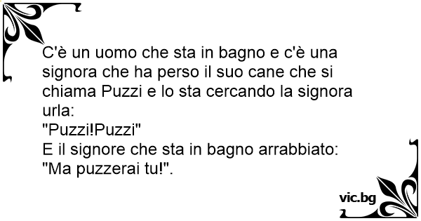 C'è un uomo che sta in bagno e c'è una signora che ha perso il suo cane che si chiama Puzzi e lo sta cercando la signora urla: