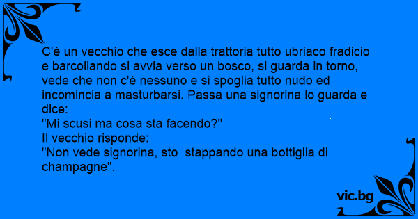 C'è un vecchio che esce dalla trattoria tutto ubriaco fradicio e barcollando si avvia verso un bosco, si guarda in torno, vede che non c'è nessuno e si spoglia tutto nudо ed incomincia a masturbarsi. Passa una signorina lo guarda e dice: