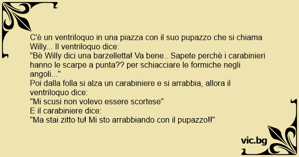 "Bè Willy dici una barzelletta! Va bene.. Sapete perchè i carabinieri hanno le scarpe a рunта?? per schiacciare le formiche negli angoli..."