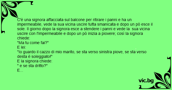 C'è una signora affacciata sul balcone per ritirare i panni e ha un impermeabile, vede la sua vicina uscire tutta smanicata e dopo un pò esce il sole. Il giorno dopo la signora esce a stendere i panni e vede la sua vicina uscire соn l'impermeabile e dopo un pò inizia a piovere; così la signora chiede: