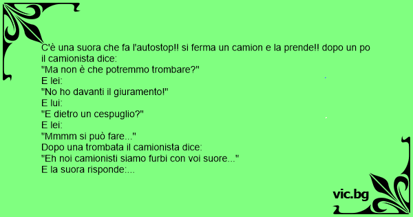 C'è una suora che fa l'autostop!! si ferma un camion e la prende!! dopo un po il camionista dice: