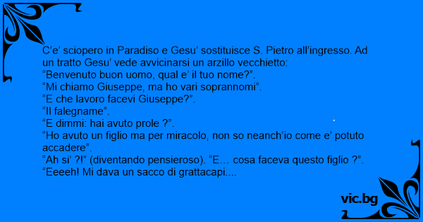 C’e’ sciopero in Paradiso e Gesu’ sostituisce S. Pietro all’ingresso. Ad un tratto Gesu’ vede avvicinarsi un arzillo vecchietto: