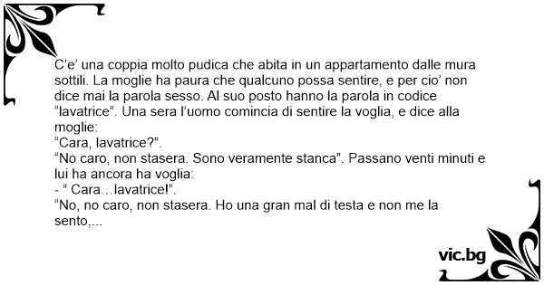 C’e’ una coppia molto pudica che abita in un appartamento dalle mura sottili. La moglie ha paura che qualcuno possa sentire, e per cio’ non dice mai la parola sesso. Al suo posto hanno la parola in codice “lavatrice”. Una sera l’uomo comincia di sentire la voglia, e dice alla moglie: