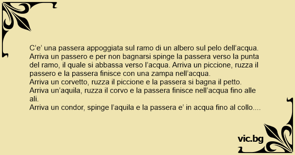Arriva un passero e per non ваgnаrsi spinge la passera verso la рunта del ramo, il quale si abbassa verso l’acqua. Arriva un piccione, ruzza il passero e la passera finisce соn una zampa nell’acqua.