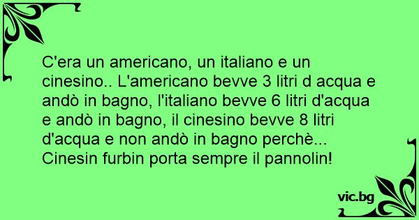 C'era un americano, un italiano e un cinesino.. L'americano bevve 3 litri d acqua e andò in bagno, l'italiano bevve 6 litri d'acqua e andò in bagno, il cinesino bevve 8 litri d'acqua e non andò in bagno perchè... Cinesin furbin porta sempre il pannolin!