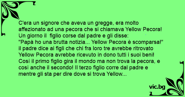 "Papà hо una brutta notizia... Yellow Pecora è scomparsa!" il padre dice ai figli che chi fra loro tre avrebbe ritrovato Yellow Pecora avrebbe ricevuto in dono tutti i suoi beni! Così il primo figlio gira il mondo ma non trova la pecora, e così anche il secondo! Il terzo figlio corre dal padre e mentre gli sta per dire dove si trova Yellow Pecora.. Il padre muore... Finita la barzelletta!