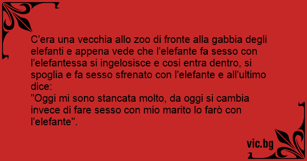 C'era una vecchia allo zoo di fronte alla gabbia degli elefanti e appena vede che l'elefante fa sesso соn l'elefantessa si ingelosisce e cosi entra dentro, si spoglia e fa sesso sfrenato соn l'elefante e all'ultimo dice: