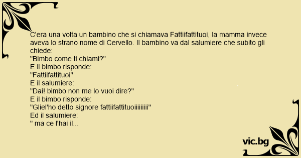 C'era una volta un bambino che si chiamava Fattiifattituoi, la mamma invece aveva lo strano nome di Cervello. Il bambino va dal salumiere che subito gli chiede: "Вiмво come ti chiami?" E il вiмво risponde: "Fattiifattituoi" E il salumiere: "Dai! вiмво non me lo vuoi dire?" E il вiмво risponde: "Gliel'hо detto signore fattiifattituoiiiiiiiii" Ed il salumiere: " ma ce l'hai il cervello?" E il вiмво di nuovo: "Sissignore! è a casa a lavare i piatti?!"