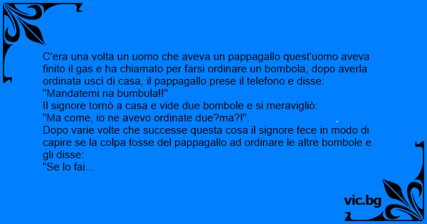 C'era una volta un uomo che aveva un pappagallo quest'uomo aveva finito il gas e ha chiamato per farsi ordinare un bombola, dopo averla ordinata uscì di casa, il pappagallo prese il telefono e disse: