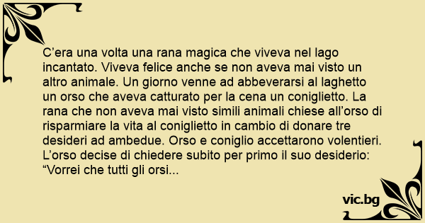 C’era una volta una rana magica che viveva nel lago incantato. Viveva felice anche se non aveva mai visto un altro animale. Un giorno venne ad abbeverarsi al laghetto un orso che aveva catturato per la cena un coniglietto. La rana che non aveva mai visto simili animali chiese all’orso di risparmiare la vita al coniglietto in cambio di donare tre desideri ad ambedue. Orso e coniglio accettarono volentieri. L’orso decise di chiedere subito per primo il suo desiderio: