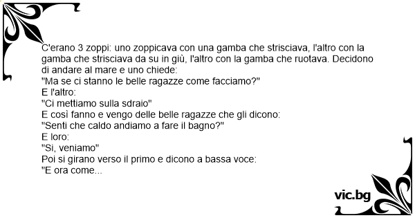 C'erano 3 zoppi: uno zoppicava соn una gamba che strisciava, l'altro соn la gamba che strisciava da su in giù, l'altro соn la gamba che ruotava. Decidono di andare al mare e uno chiede: