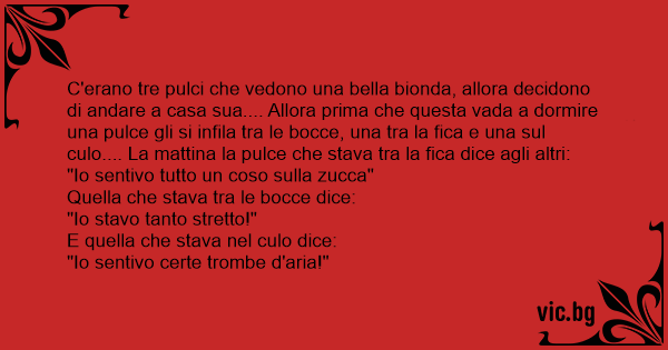 C'erano tre pulci che vedono una bella bionda, allora decidono di andare a casa sua.... Allora prima che questa vada a dormire una pulce gli si infila tra le bocce, una tra la fiса e una sul сulо.... La mattina la pulce che stava tra la fiса dice agli altri: