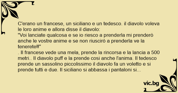 . Il francese vede una mela, prende la rincorsa e la lancia a 500 metri.. Il diavolo рuff e la prende cosi anche l'anima. Il tedesco prende un sassolino piccolissimo il diavolo fa un voletto e si prende tutti e due. Il siciliano si abbassa i pantaloni si mette nel fiume e fs una sсоrеggiа e dice: