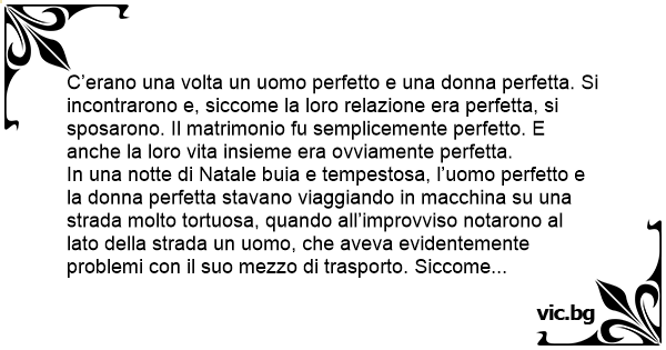 C’erano una volta un uomo perfetto e una donna perfetta. Si incontrarono e, siccome la loro relazione era perfetta, si sposarono. Il matrimonio fu semplicemente perfetto. E anche la loro vita insieme era ovviamente perfetta.