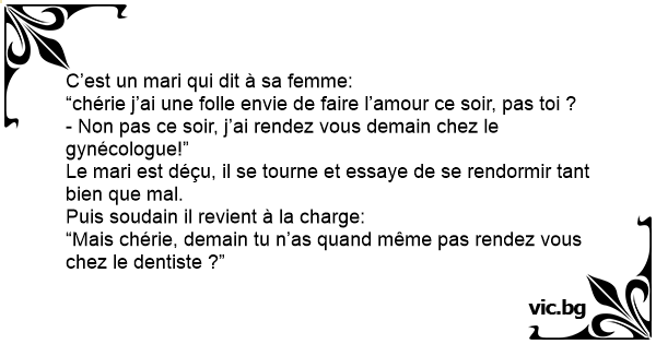 - Non pas ce soir, j’ai rendez vous demain chez le gynécologue!”