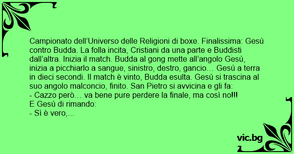 Campionato dell’Universo delle Religioni di boxe. Finalissima: Gesù contro Budda. La folla incita, Cristiani da una parte e Buddisti dall’altra. Inizia il match. Budda al gong mette all’angolo Gesù, inizia a picchiarlo a sangue, sinistro, destro, gancio… Gesù a terra in dieci secondi. Il match è vinto, Budda esulta. Gesù si trascina al suo angolo malconcio, finito. San Pietro si avvicina e gli fa: