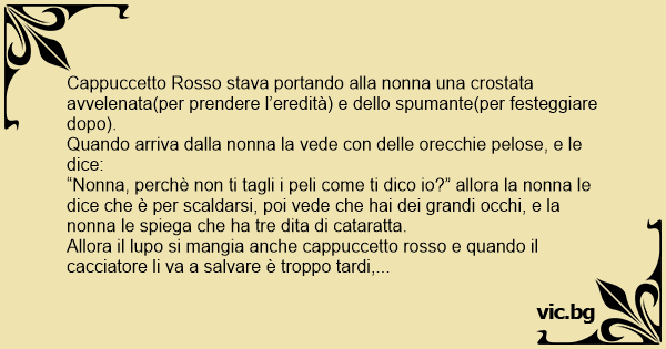 Cappuccetto Rosso stava portando alla nonna una crostata avvelenata(per prendere l’eredità) e dello spumante(per festeggiare dopo).