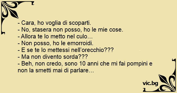 Due fidanzati devono fare sesso il fidanzato le dice: "Oggi il cazzo te lo posso mettere nell'orecchio?" E la fidanzata: "Ma sei scemo?così divento sorda" E il fidanzato: "Perchè tutte le altre...