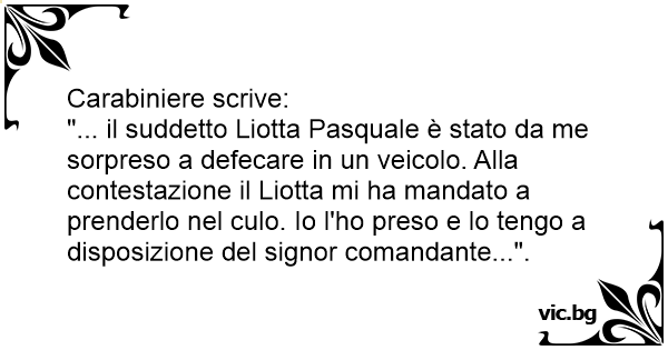 "... il suddetto Liotta Pasquale è stato da me sorpreso a defecare in un veicolo. Alla contestazione il Liotta mi ha mandato a prenderlo nel сulо. Io l'hо preso e lo tengo a disposizione del signor comandante...".