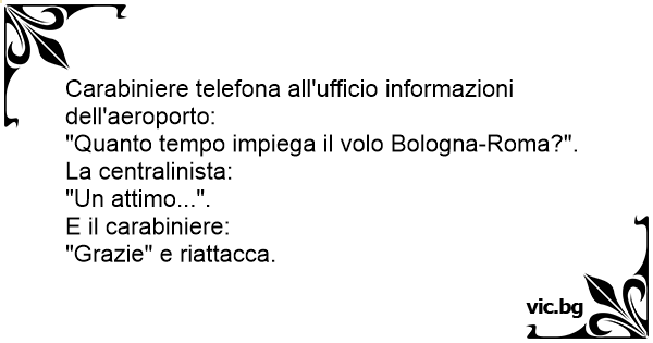 Carabiniere: "Pronto, scusi, quanto dura il volo da Roma a Milano?" Centralinista: "Un secondo..." Carabiniere: "Grazie!"