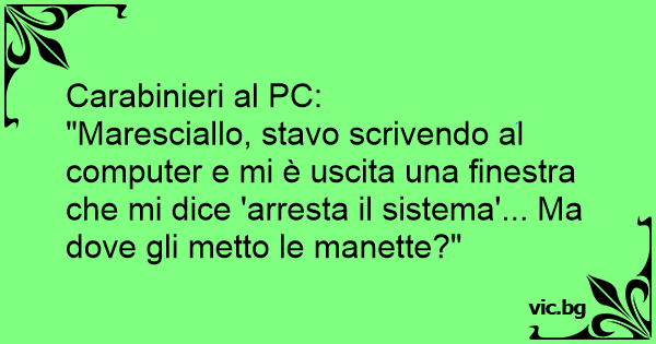 "Maresciallo, stavo scrivendo al computer e mi è uscita una finestra che mi dice 'arresta il sistema'... Ma dove gli metto le manette?"