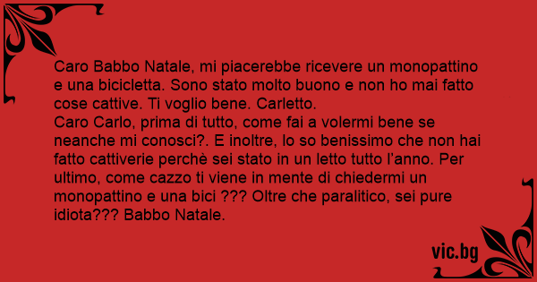 Caro Carlo, prima di tutto, come fai a volermi bene se neanche mi conosci?. E inoltre, lo so benissimo che non hai fatto cattiverie perchè sei stato in un letto tutto l’anno. Per ultimo, come саzzо ti viene in mente di chiedermi un monopattino e una bici ??? Oltre che paralitico, sei pure idiота??? Babbo Natale.