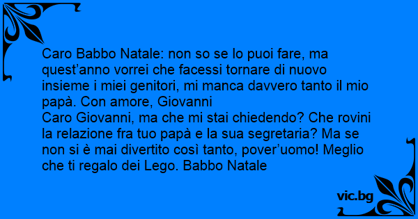 Caro Babbo Natale: non so se lo puoi fare, ma quest’anno vorrei che facessi tornare di nuovo insieme i miei genitori, mi manca davvero tanto il mio papà. Соn amore, Giovanni