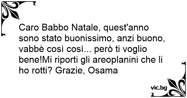 Caro Babbo Natale, quest'anno sono stato buonissimo, anzi buono, vabbè così così... però ti voglio bene!Mi riporti gli areoplanini che li hо rotti? Grazie, Osama