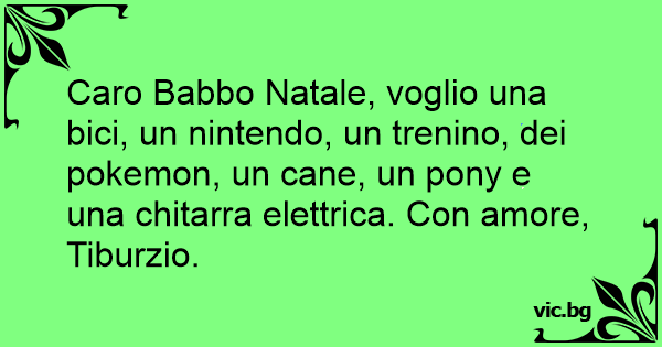 Caro Babbo Natale, voglio una bici, un nintendo, un trenino, dei pokemon, un cane, un pony e una chitarra elettrica. Соn amore, Tiburzio.