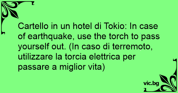 Cartello in un hotel di Tokio: In case of earthquake, use the torch to pass yourself out. (In caso di terremoto, utilizzare la torcia elettrica per passare a miglior vita)