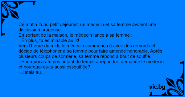 Vers l’heure du midi, le médecin commença à avoir des remords et décide de téléphoner à sa femme pour faire amende honorable. Après plusieurs coups de sonnerie, sa femme répond à bout de souffle.