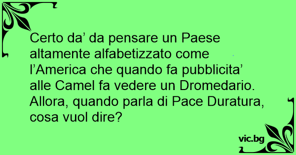 Certo da’ da pensare un Paese altamente alfabetizzato come l’America che quando fa pubblicita’ alle Camel fa vedere un Dromedario. Allora, quando parla di Pace Duratura, cosa vuol dire?