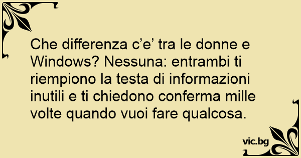 Che differenza c’e’ tra le donne e Windows? Nessuna: entrambi ti riempiono la testa di informazioni inutili e ti chiedono conferma mille volte quando vuoi fare qualcosa.