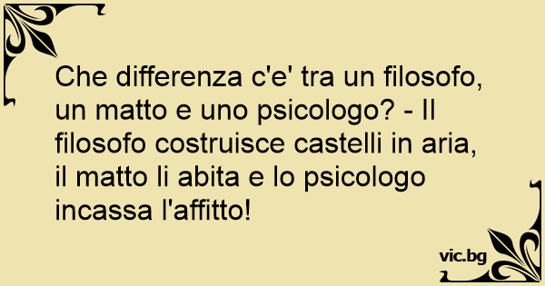 Che differenza c'e' tra un filosofo, un matto e uno psicologo? - Il filosofo costruisce castelli in aria, il matto li abita e lo psicologo incassa l'affitto!