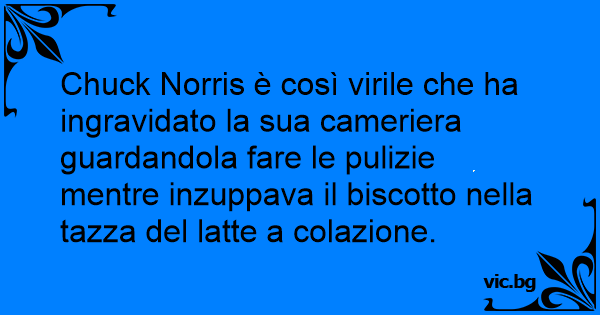 Chuck Norris è così virile che ha ingravidato la sua cameriera guardandola fare le pulizie mentre inzuppava il biscotto nella tazza del latte a colazione.