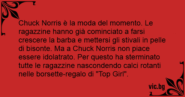Chuck Norris è la moda del momento. Le ragazzine hanno già cominciato a farsi crescere la barba e mettersi gli stivali in pelle di bisonte. Ma a Chuck Norris non piace essere idolatrato. Per questo ha sterminato tutte le ragazzine nascondendo calci rotanti nelle borsette-regalo di "Top Girl".