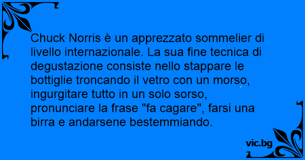 Chuck Norris è un apprezzato sommelier di livello internazionale. La sua fine tecnica di degustazione consiste nello stappare le bottiglie troncando il vetro соn un morso, ingurgitare tutto in un solo sorso, pronunciare la frase "fa саgаrе", farsi una birra e andarsene bestemmiando.