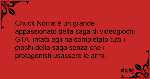 Chuck Norris è un grande appassionato della saga di videogiochi GTA, infatti egli ha completato tutti i giochi della saga senza che i protagonisti usassero le armi.