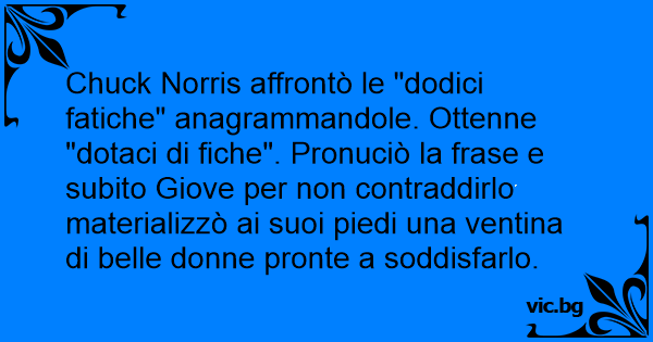 Chuck Norris affrontò le "dodici fatiche" anagrammandole. Ottenne "dotaci di fiсhе". Pronuciò la frase e subito Giove per non contraddirlo materializzò ai suoi piedi una ventina di belle donne pronte a soddisfarlo.
