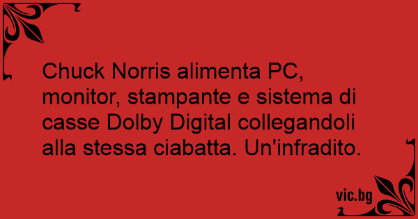 Chuck Norris alimenta PC, monitor, stampante e sistema di casse Dolby Digital collegandoli alla stessa ciabatta. Un'infradito.