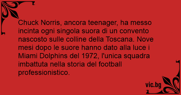 Chuck Norris, ancora teenager, ha messo incinta ogni singola suora di un convento nascosto sulle colline della Toscana. Nove mesi dopo le suore hanno dato alla luce i Miami Dolphins del 1972, l'unica squadra imbattuta nella storia del football professionistico.
