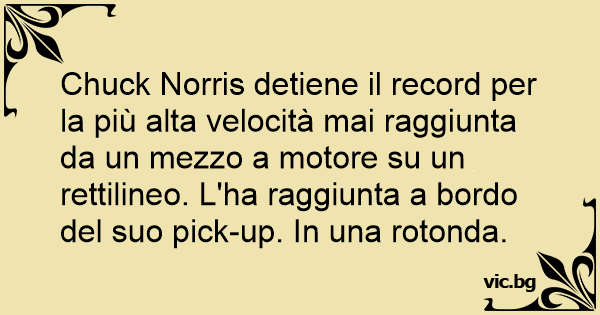 Chuck Norris detiene il record per la più alta velocità mai raggiunta da un mezzo a motore su un rettilineo. L'ha raggiunta a bordo del suo pick-up. In una rotonda.