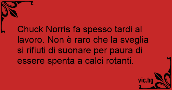 Chuck Norris fa spesso tardi al lavoro. Non è raro che la sveglia si rifiuti di suonare per paura di essere spenta a calci rotanti.